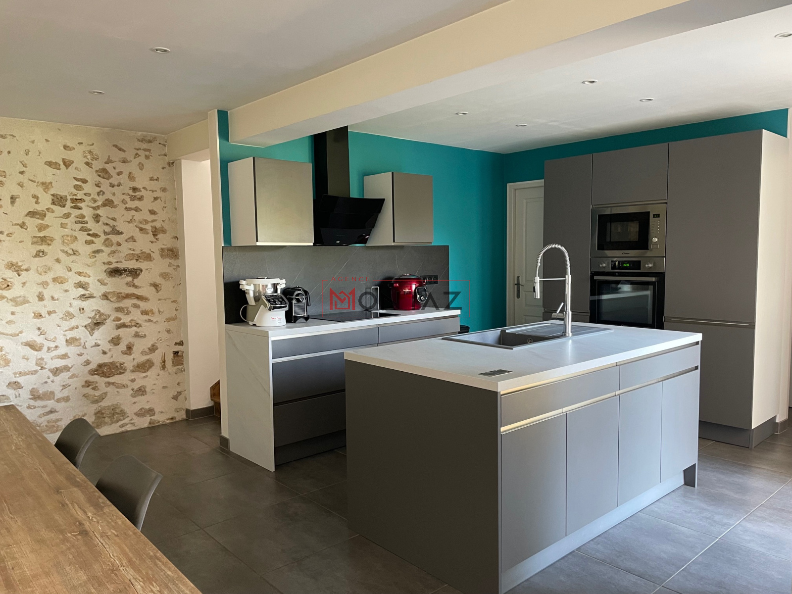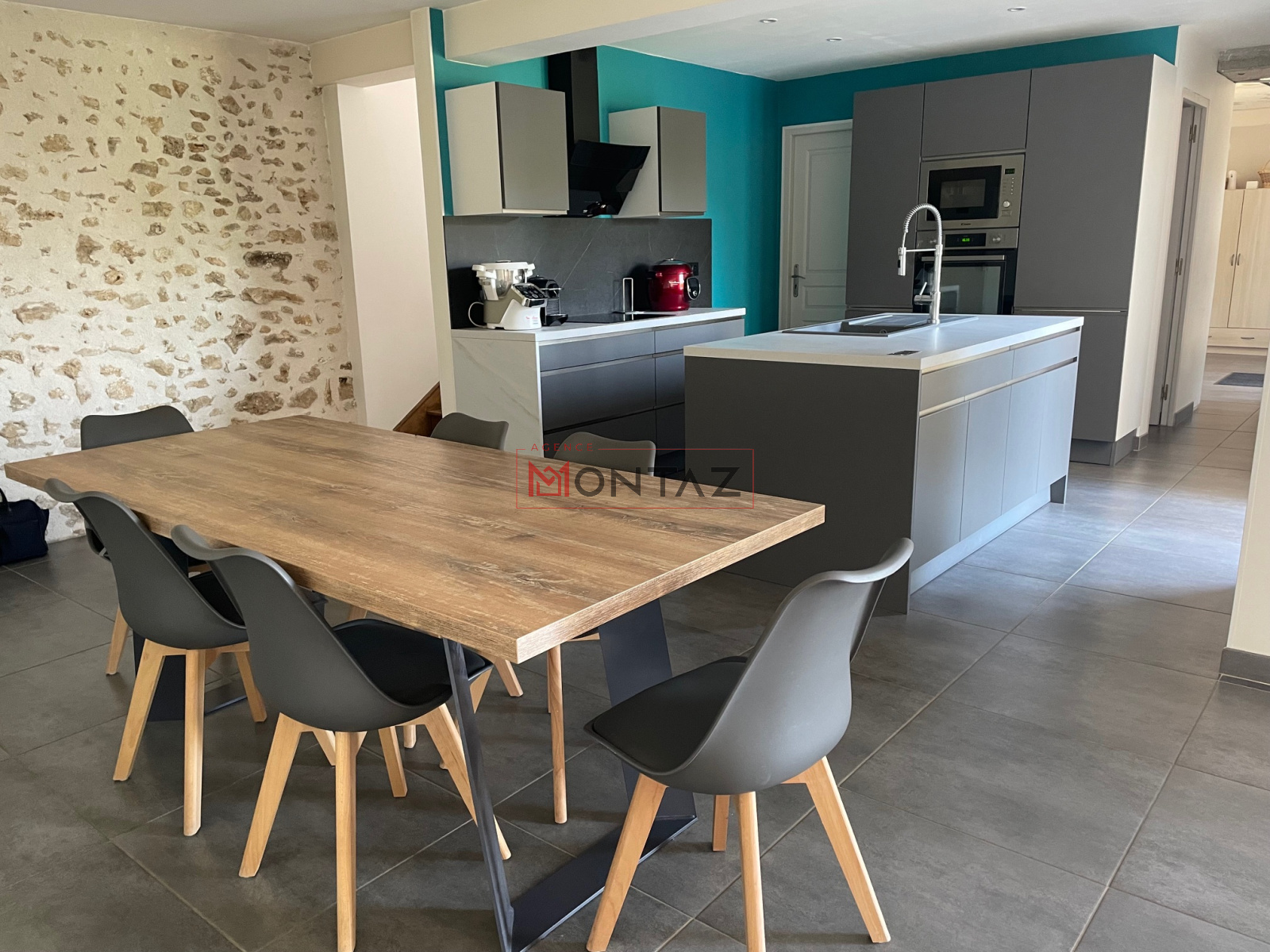 Le rez-de-chaussée se compose d’une entrée, d’un vaste séjour/salon chaleureux avec poêle à bois, et d’une cuisine ouverte aménagée, ainsi que de WC séparés.
