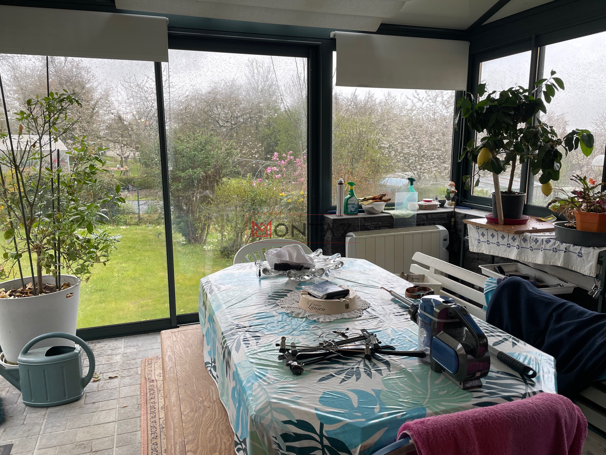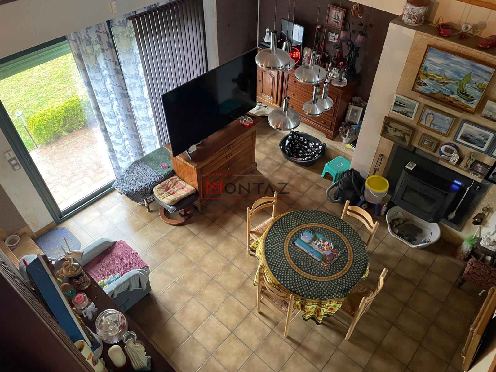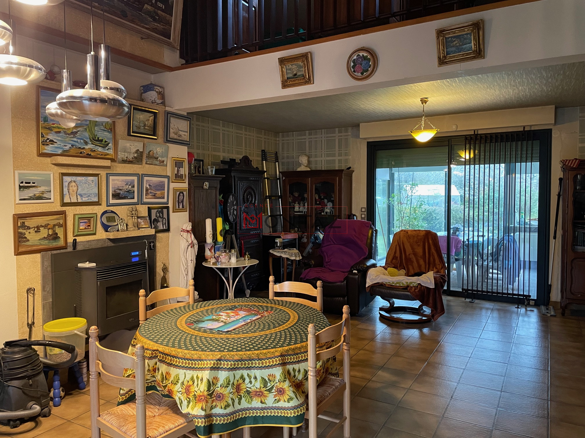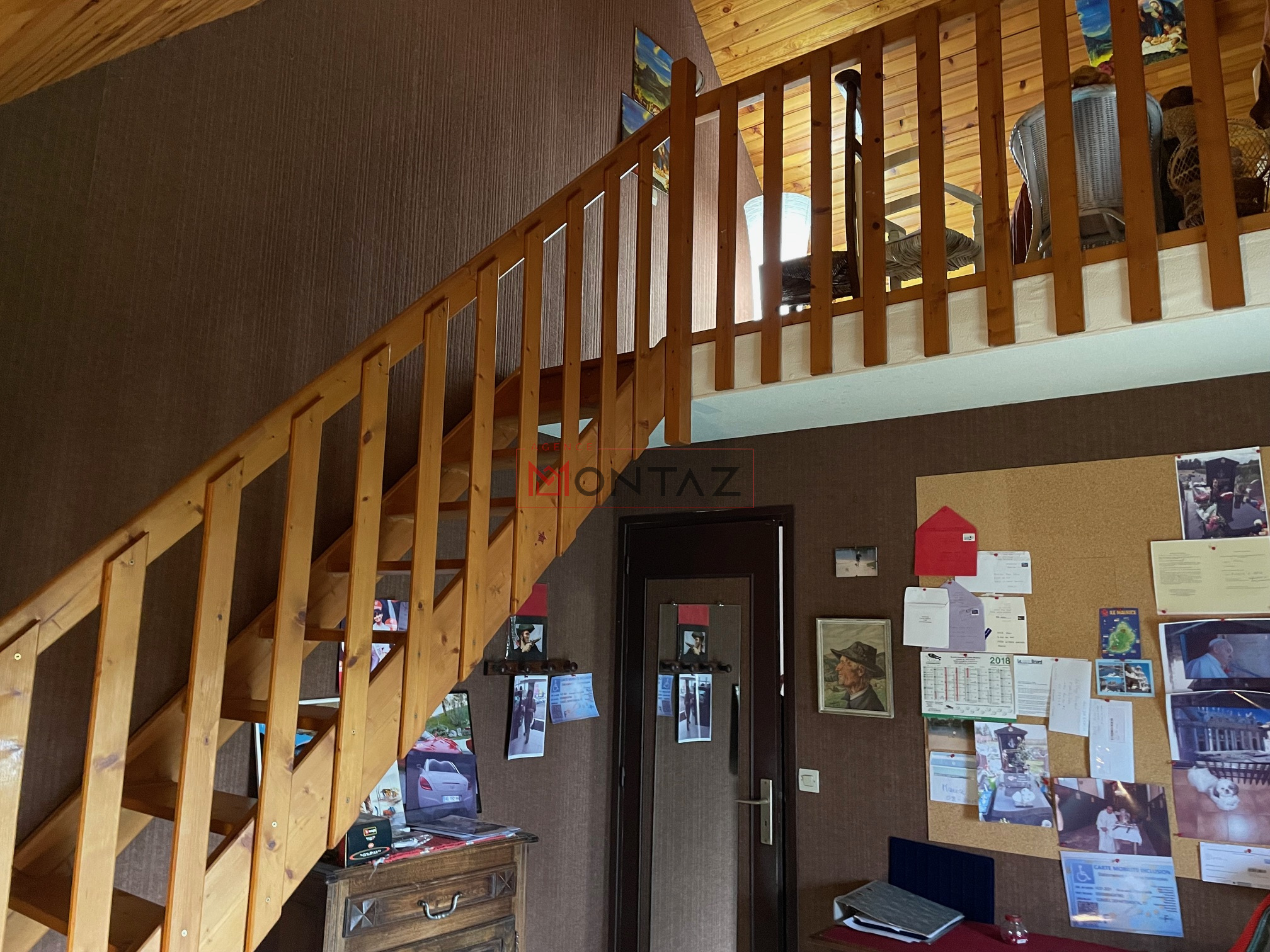 RDC : entrée, grand séjour/salon cathédrale avec cheminée et mezzanine, accès à la véranda chauffée, cuisine aménagée, 2 chambres, placard de rangement, WC, SDB